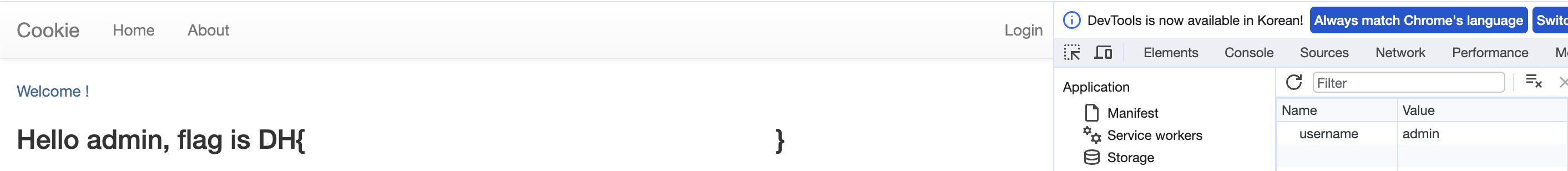 ๋ฌธ์ ์์ admin ๊ณ์ ์ผ๋ก ๋ก๊ทธ์ธ ํ๋ผ๊ณ ํ์ผ๋ ์ฟ ํค๋ฅผ ์กฐ์ํด์ ์๋ก๊ณ ์นจ์ ํ๋ ๋ค์๊ณผ ๊ฐ์ด ๋ต์ด ๋์๋ค.