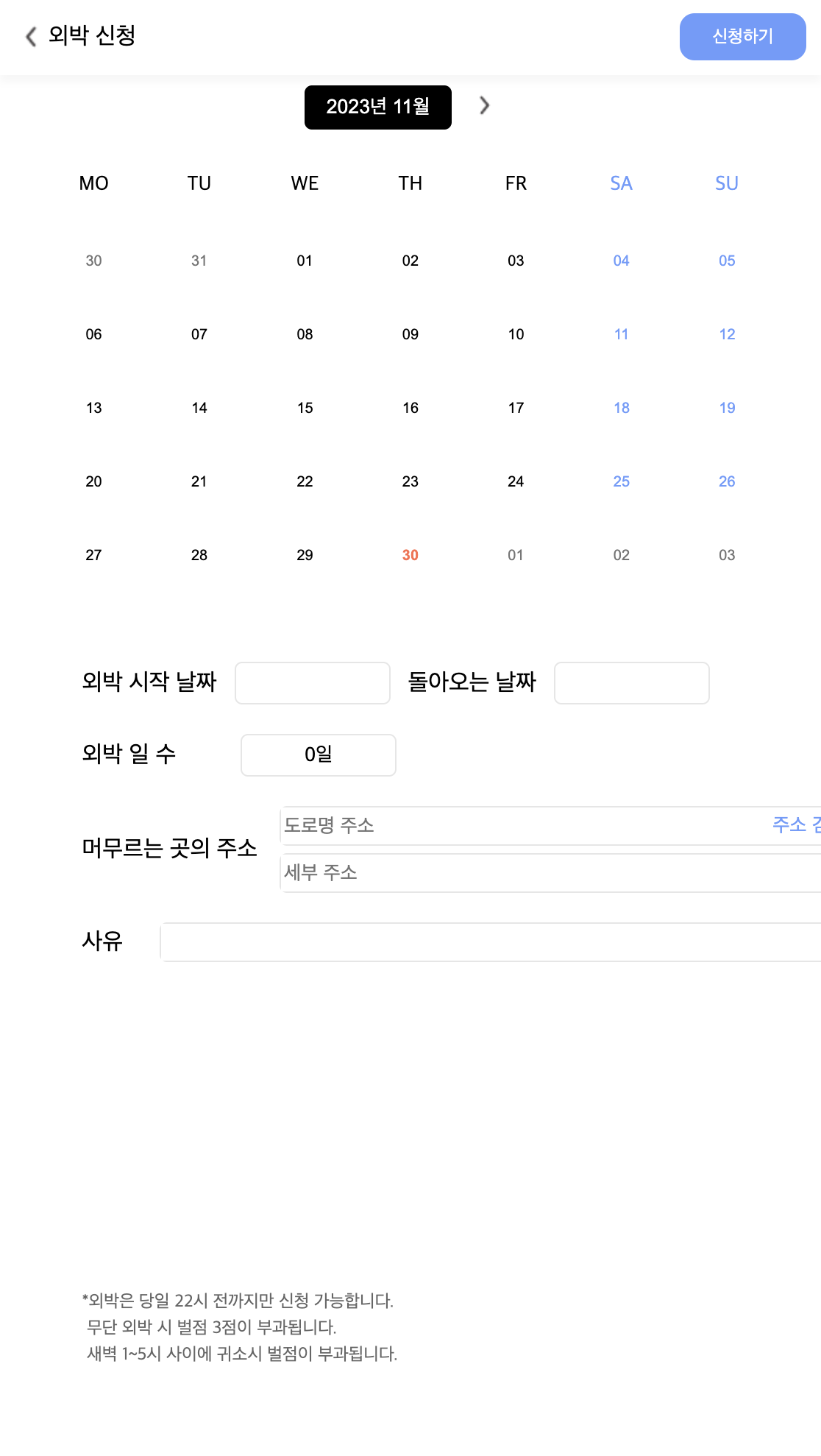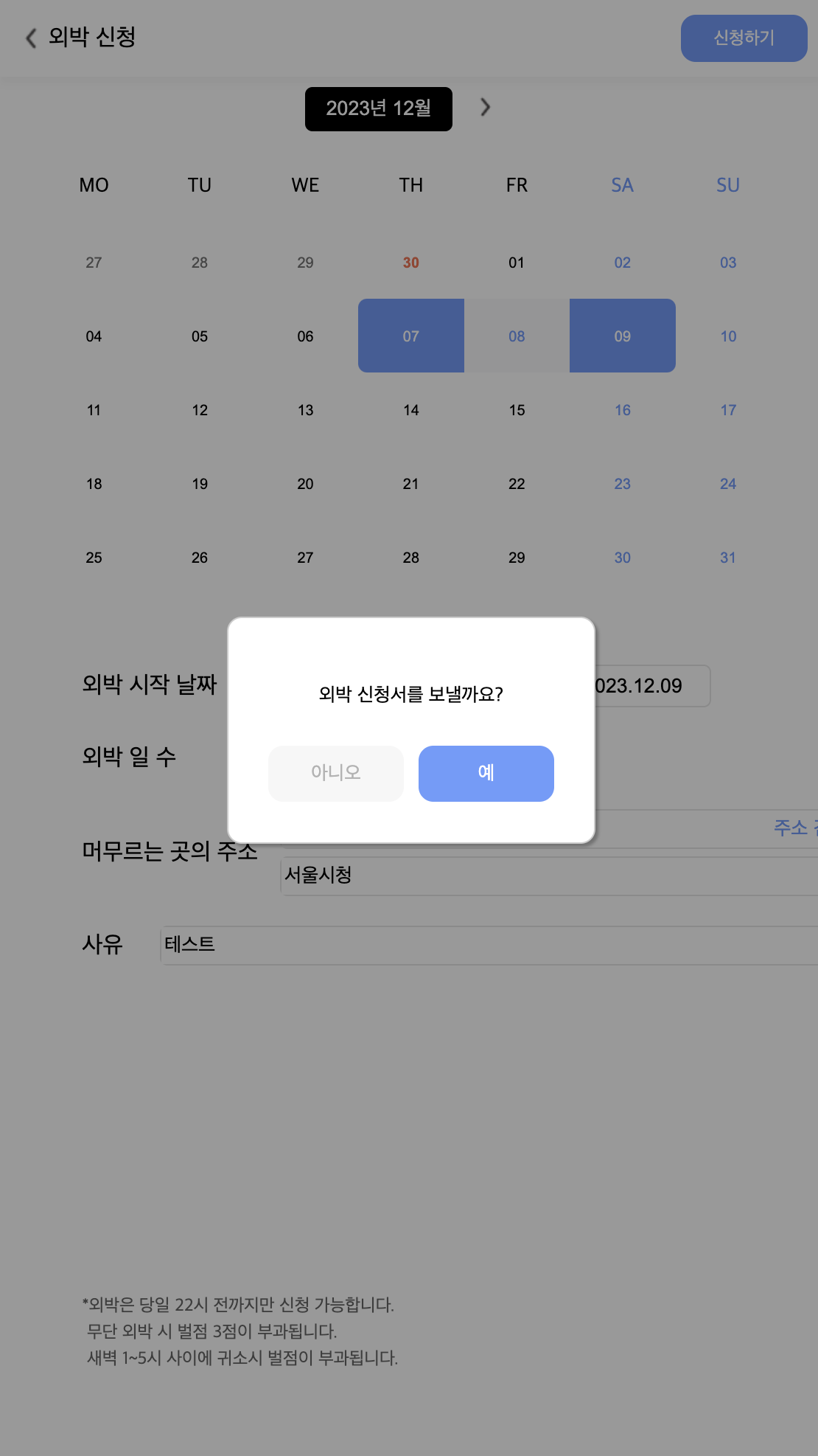 ์ธ๋ฐ์ ์ฒญ๋์์๋ ํผ ์์ฑ ํ ์ ์ฒญํ๊ธฐ -> ํ์ธ ์์ผ๋ก ๋ฒํผ์ ๋๋ฅด๋ฉด ํผ์ ์์ฑํ ๋ด์ฉ์ด ๋ฐฑ์๋๋ก ์ ๋ฌ๋๋ค.