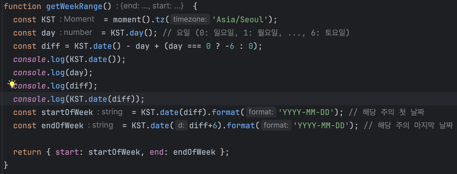 const startOfWeek = KST.date(diff).format('YYYY-MM-DD'); // ํด๋น ์ฃผ์ ์ฒซ ๋ ์ง